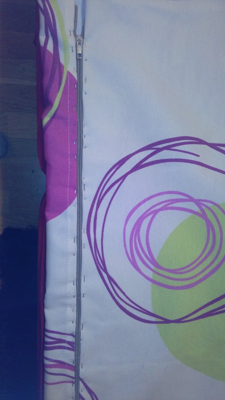 La abertura que hemos dejado la coseremos a mano, y a continuación empezaremos con la tela vista. El sistema es el mismo pero incluiremos cremallera. Cosemos los extremos igual que hemos hecho antes dejando la zona del centro sin coser, que en este caso será el tamaño que tenga la cremallera que vamos a poner.