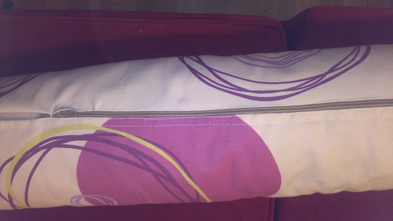Primero me he hecho con el relleno para el cojin, he reciclado cojines que ya no uso, y después he cortado la tela para hacer la funda del relleno. En mi caso necesito dos circulos de 25 cm y un largo de 82 cm por 74.